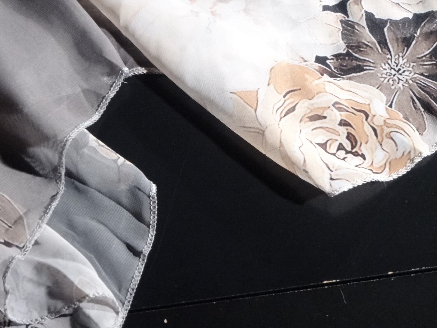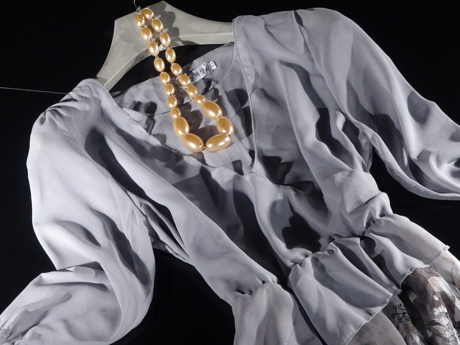 お洒落なプリントに柔らかいシフォン素材でとても着やすくこの一枚でとてもエレガントなマキシ丈ワンピ-スです!!袖の先端部分は絞られています。裾は、真ん中が少し短くなっています。女性度UP間違いなしの商品です。 ファスナ-なし。裏地あり。