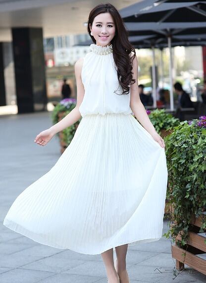 着やすく涼しげなスカート部分総プリーツのワンピースです。生地も軽く風になびく、かろやかな印象です。長時間着ていても楽です。クリ-ムが大人の上品さを醸し出しています。 裏地有り。 ネックレス付き。