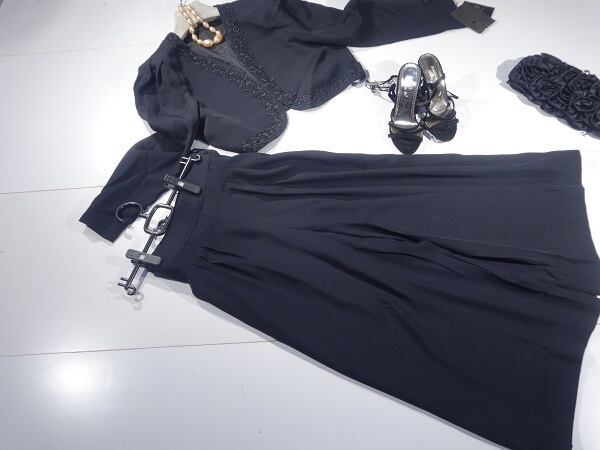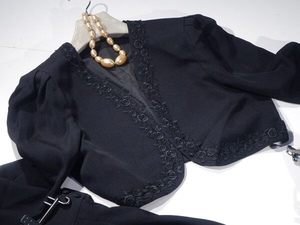 品の良い黒のショートボレロとワイドパンツのセット。ショートボレロは肩パッドでかっちりとした印象。留め具なし、前で左右合わせるタイプ。ワイドパンツは生地をたっぷりと使用し、一見マキシ丈のスカートに見え、シンプルでエレガントなライン。サイドがゴム仕様になっているので、サイズ的にゆとりを持って着用頂けます。上品で優しい大人の女性を表現してくれる一着です。 ワイドパンツはサイドファスナーつき。ペチコ-ト付き。