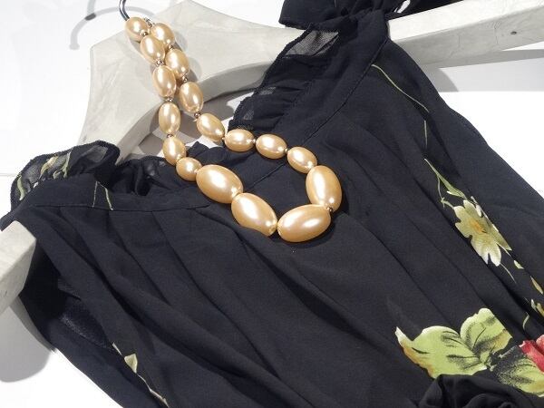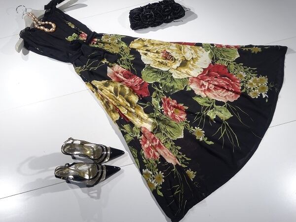 しなやかで流れるようなラインが美しい花柄プリントのワンピースです。黒地に少し落ち着いた色調の花柄がプリントされていて、ウエストリボンで全体に引き締まった印象を与えています。襟ぐりはフリル仕様で、左肩の部分はリボンで結ぶようになっています。優雅でフェミニンなデザインですので、結婚式、二次会、イベント、パーティ・・・と、様々なシーンで活躍してくれる一枚です。