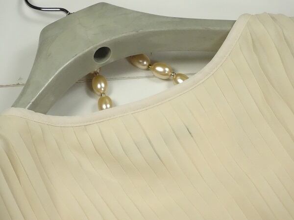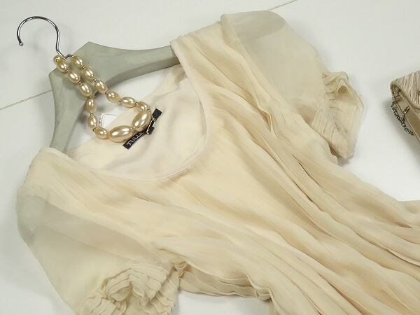 豪華さと優雅さを併せ持つ総プリーツシルク100%のワンピース。上品でしなやか。どんなシーンにも合わせられるのがベージュのワンピース。袖とスカートの裾部分に施されたフリルがエレガントな印象を与えています。裏地付。