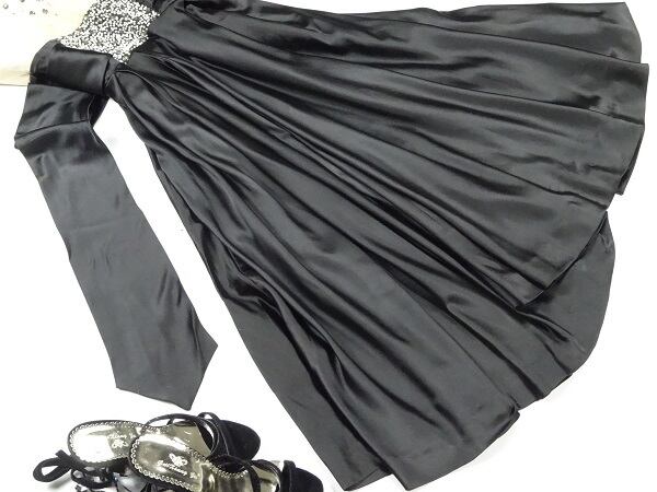 胸元とウエストラインにあしらわれたビーズが上品で美しいシルク100%のミディアムドレスです。バストラインにはクールなステッチ、袖ぐりは可愛いフリルがデザインされています。ウエストから下は上見頃のエレガントさとはガラッとかわり、光沢のある黒がクールなフレアスカートになっています。ウエストリボンは背中で結び、クールさとエレガントさと可愛らしさを併せ持った、大変素敵な一枚です。結婚式や二次会、パーティー、お茶会など気品のある佇まいで、みんなの視線を集めること必至です。左ファスナー。裏地付。