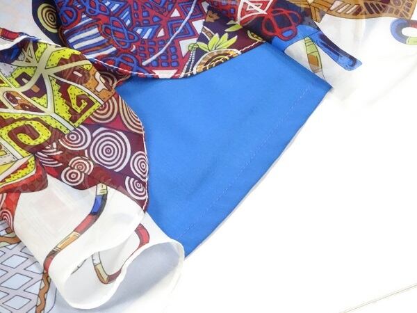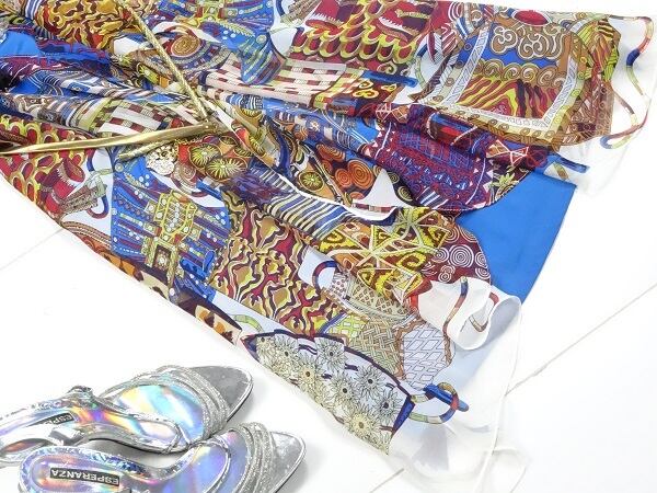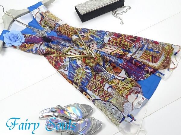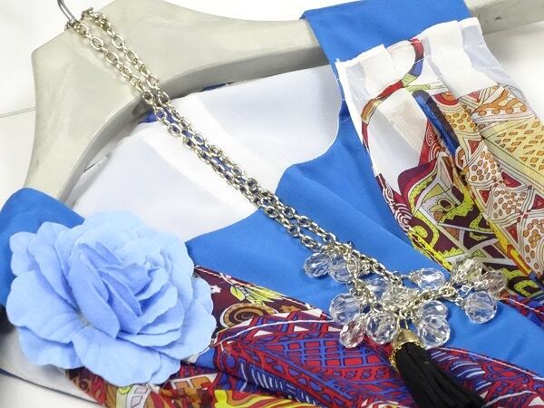 しなやかなシルク地が肌に心地よいワンピース。前部分のみ、青いノースリーブワンピースの上にスカーフ柄がプリントされた上地がふんわりと両サイドから被さるデザインになっています。肩にはブルーの取り外し可能なコサージュをあしらい、ウエストには金色のロープ上に依ったおしゃれなベルト。大きなフェイククリスタルストーンが印象的なネックレスが華やかさをプラスしています。アクセの使い方でいろいろなイメージを楽しんで頂ける一着です。コサージュ・ネックレス・ベルト付。背中ファスナー。裏地あり。