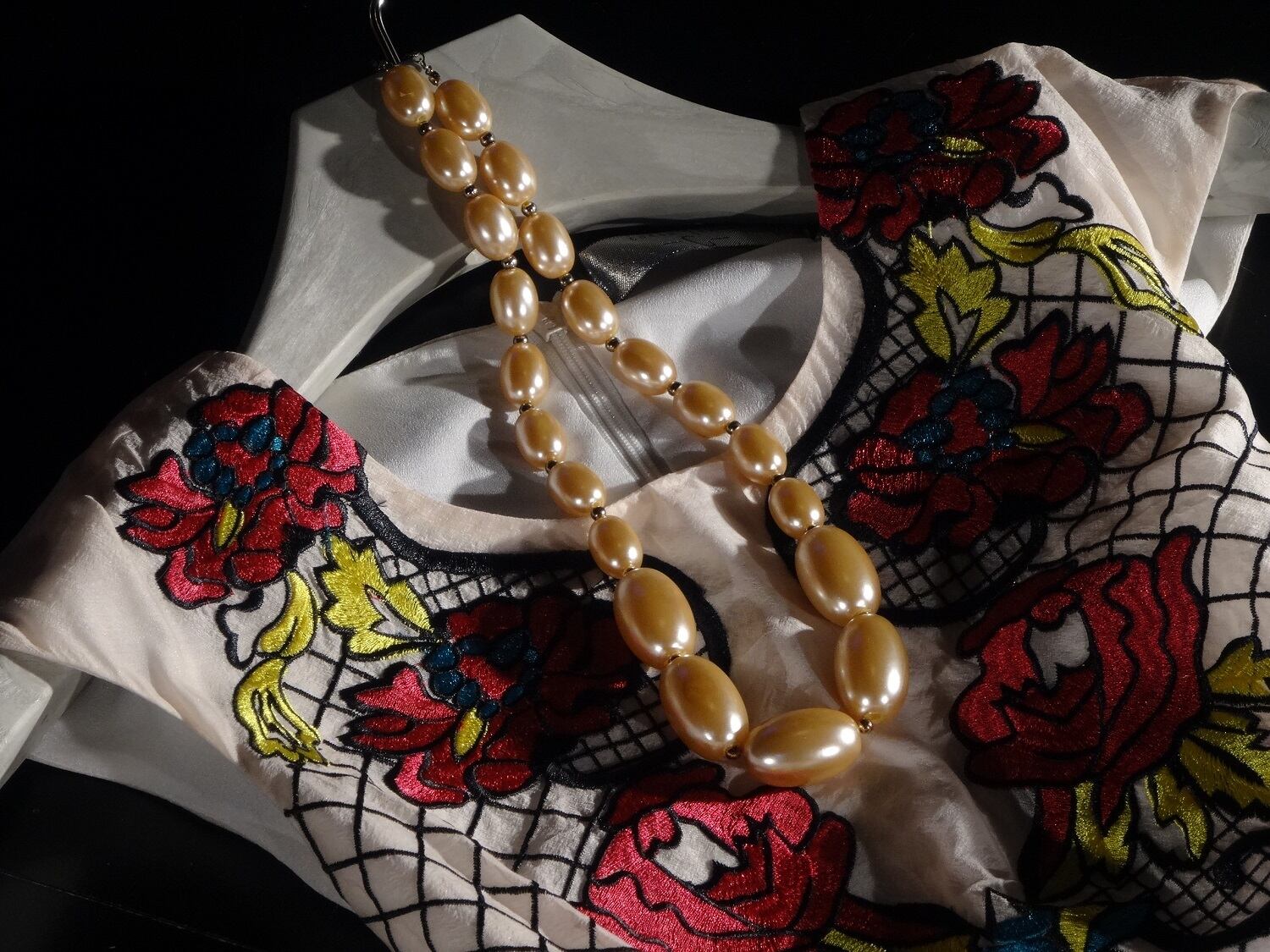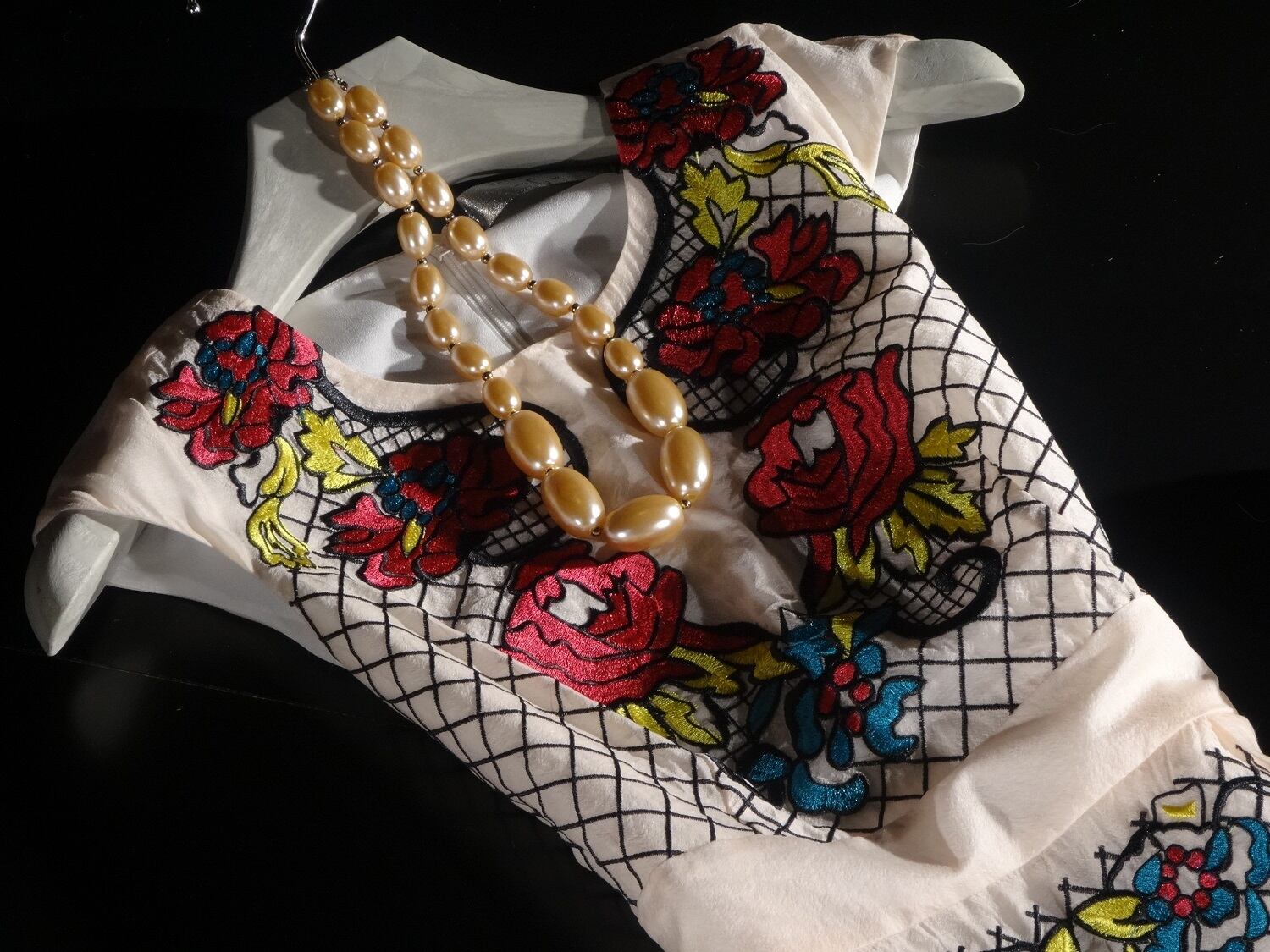 爽やかなピンクカラーのしなやかな地に、赤や青、黄色の原色の刺繍糸でポップな花模様をあしらったワンピース。ノスタルジックでいて、モダンなテイストの不思議な魅力のある一着です。背中ファスナー。裏地有。