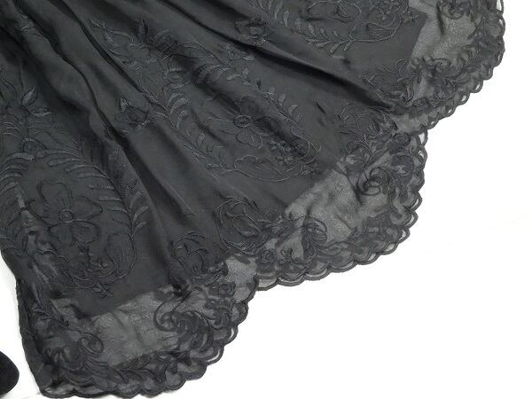 胸元には、ビ-ズの装飾されていてウエスト部分には、美しい模様の刺繍が施されています。スカ-ト部分にも刺繍が施されていて歩くたびに揺れる裾が女性らしさをUP!!。シックでとてもエレガントな一着です。裏地あり。