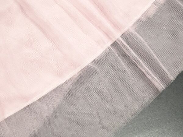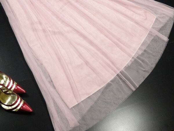 レースとチュールのドレス。上半身はサテンの裏地の上にレースをかさね、ウエストからスカートの裾まではサテンの上にチュールを重ねています。たっぷりと使用されたチュールが揺れるごとに着る人の足元を美しく見せてくれます。背中はシャーリング仕様になっているので伸縮性があり、サイズ的にゆとりをもって着用いただけます。パーティやライブ、イベント、結婚式など、どんなシーンでも活躍してくれる一着です。右サイドファスナー有。裏地付。胸パット付き。