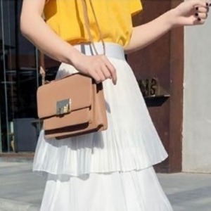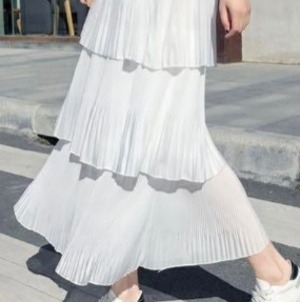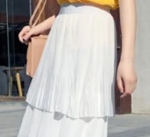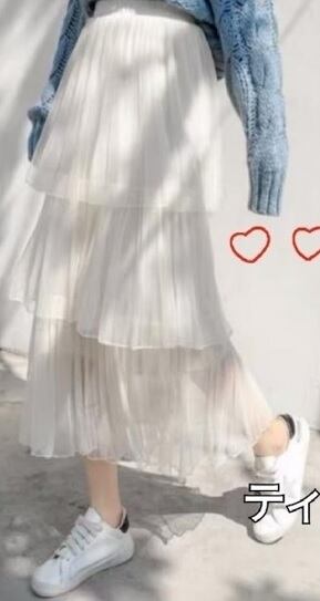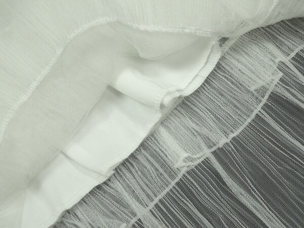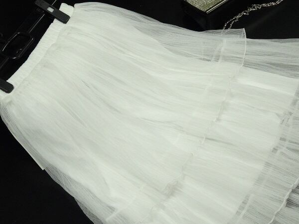 チュ-ルのレイアードロングスカ-ト。白のチュールを3段に重ねて、柔らかな揺れ感が魅力的なデザイン。履くだけで引き立つとてもファミニンなスカ-トです。ウエストゴム仕様でサイズにゆとりをもって着用いただけます。ファスナ-なし。裏地付。