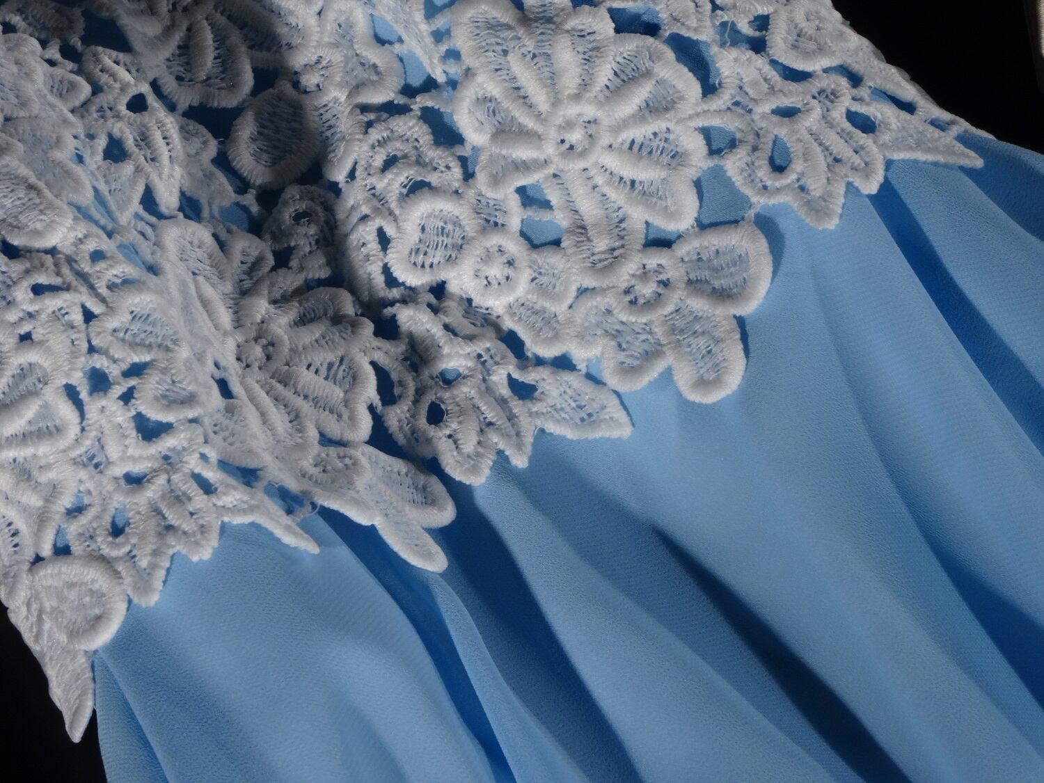 レース刺繍とたっぷりフレアが優しい印象のワンピースです。緩やかなラウンドネックとノースリーブがトップスのレース刺繍と重なって爽やかさをアップしています。スカート部分はたっぷりとシフォン生地を使ったフレア仕様。品の良い魅力的な一着です。サイドファスナー。裏地あり。