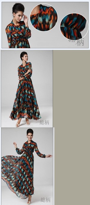 柔らかい生地に、オーロラ柄がとてもエレガントなマキシ丈のワンピースです。スカート部は生地がたっぷり使用されていますので歩くたびの揺れ感がとても女性らしくまるで女優になった気分にさせてくれます。大人のエレガンスさを感じさせてくれるシンプルデザインです。裏地あり。