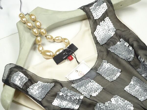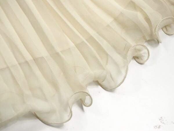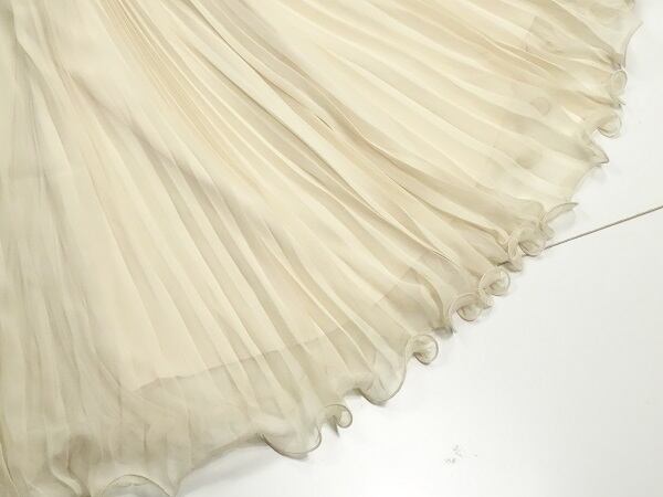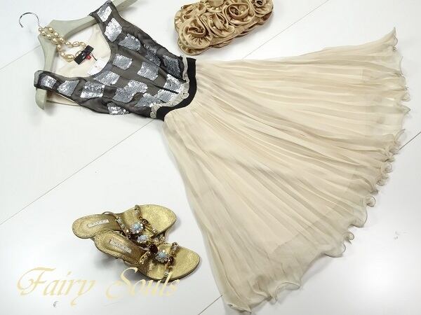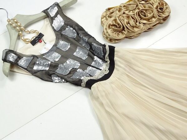 スパンコールが美しいシルク100%のワンピースです。胸元小さなスパンコールが綺麗なスクエアを描いてあしらわれています。ウエストには全体をキュッと引き締める黒のアクセントが。スカート部分は細かなたっぷりとしたプリーツで、足元を美しく見せてくれます。裏地付。