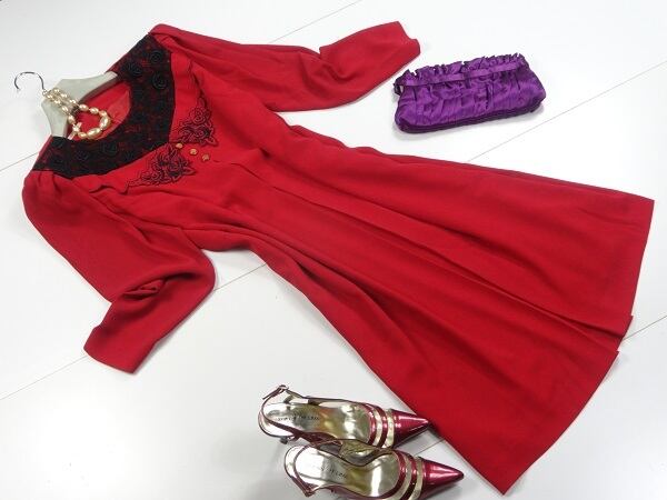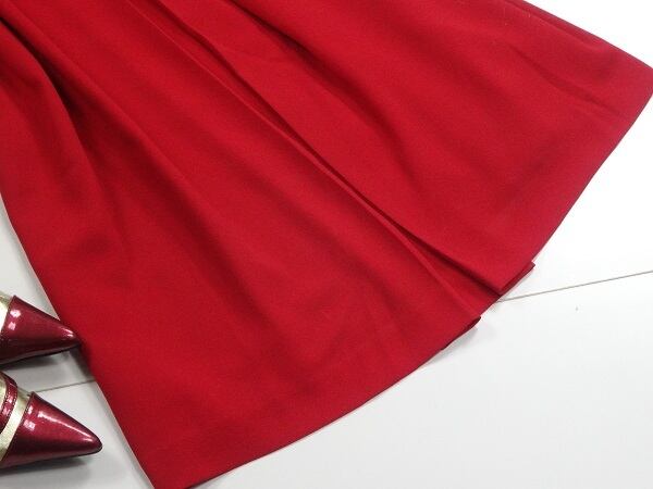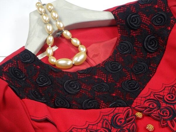 胸元薔薇モチーフ刺繍のワンピース。襟元は黒のネット地に黒の薔薇モチーフをあしらった豪華な仕様。フロントの可愛い飾りボタンの下、ウエストから裾にかけては、鮮やかな赤の生地をたっぷりと使用したセンタープリーツ仕立て。華やかでキュートな一着です。肩パッド付。背中ファスナー。裏地あり。