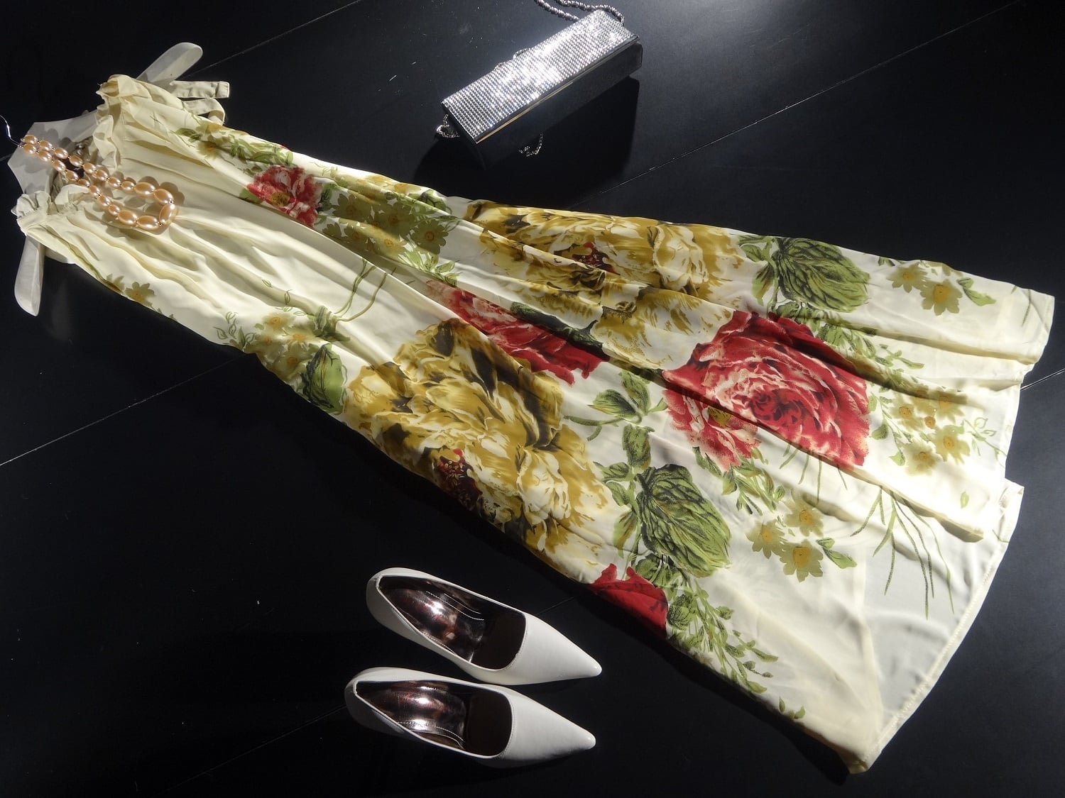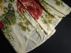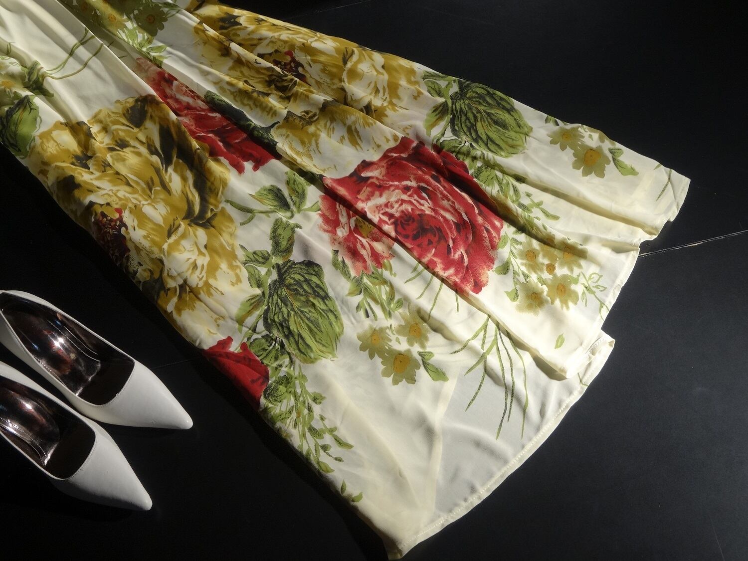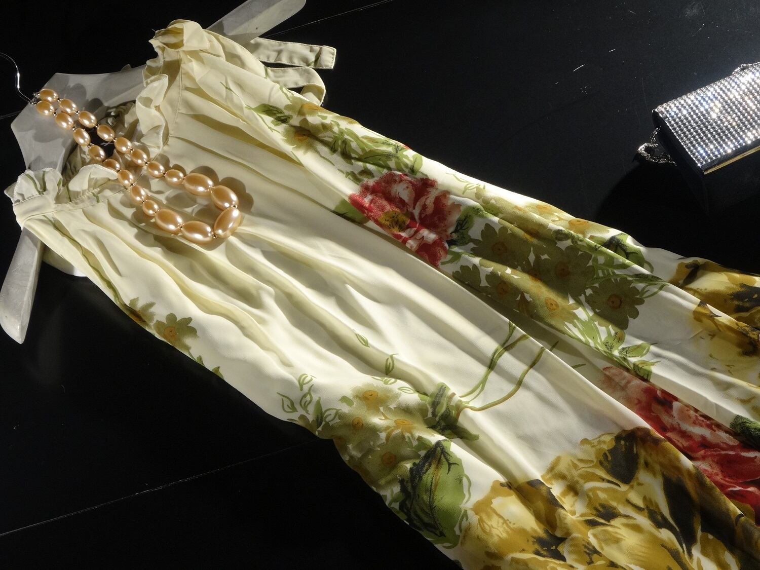 しなやかで流れるようなラインが美しい花柄プリントのワンピースです。クリームカラーに少し落ち着いた色調の花柄がプリントされていています。襟ぐりはフリル仕様で、左肩の部分はリボンで結ぶようになっています。優雅でフェミニンなデザインですので、結婚式、二次会、イベント、パーティ・・・と、様々なシーンで活躍してくれる一枚です。