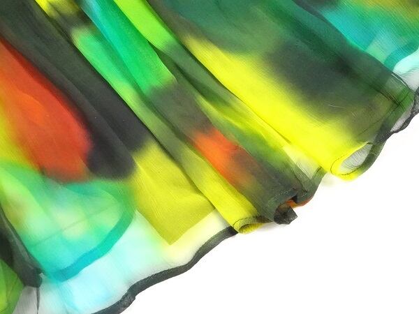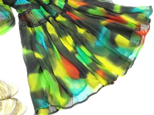 鮮やかなオーロラ模様が美しくプリントされたシックな大人テイストのワンピース。身頃部分にゴムリボンがあしらわれているので伸縮性があり、エレガントセクシーな透け感の軽やかなシルク生地の下から、黒のインナーが上品なセクシー感を漂わせています。インナー付。