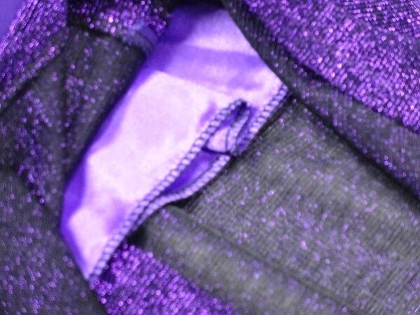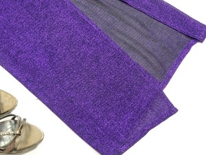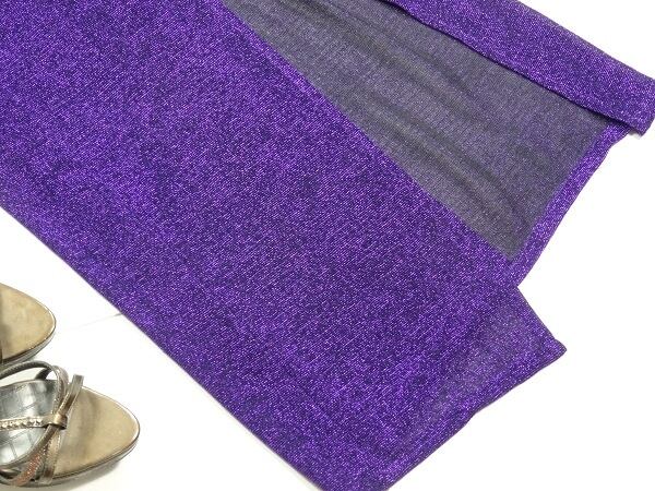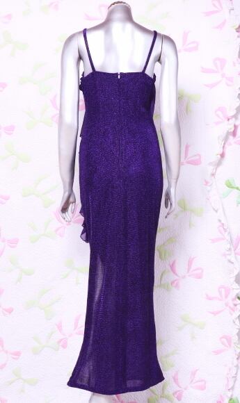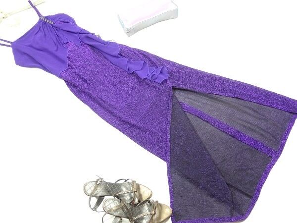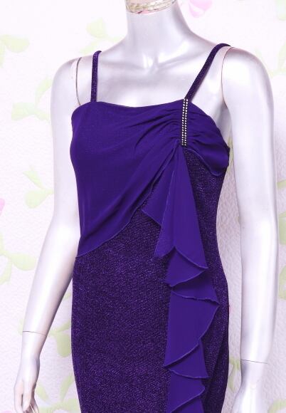 フリルが魅力的な紫のスリット入ドレス。ラメの入ったジャージ素材の生地を使用。スレンダーな中に伸縮背をもたせています。胸元から左サイドにフリルを配し、胸元のビジューがアクセントになっています。右サイドは裾から55cm位のスリットが入っていて、さわやかさとセクシーさをあわせもったデザインになっています。肩紐調整不可。背中ファスナー。裏地あり。
