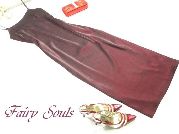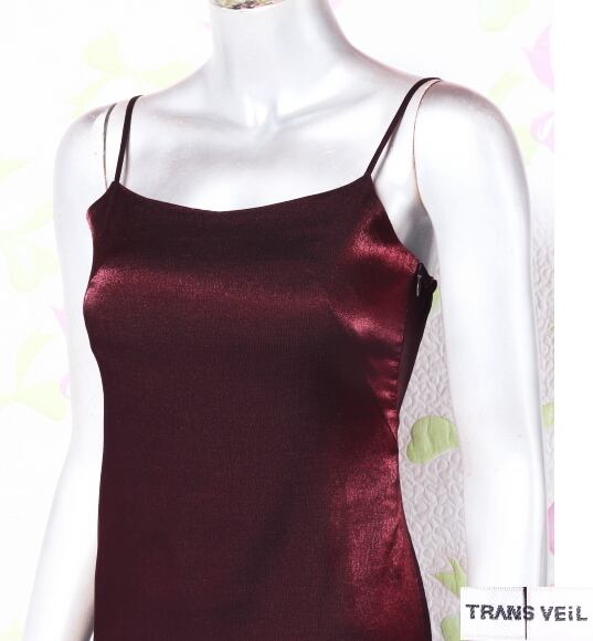 スリット入り光沢のあるキャミドレス。光沢と伸縮性のある赤茶色の生地をスレンダーに使用した大人デザインのキャミソールタイプのドレス。左サイドには裾から約59cm位のスリットが入っていて、さわやかさとセクシーさをあわせもったデザインになっています。肩紐調整不可。左脇ファスナー。裏地あり。