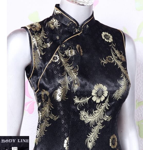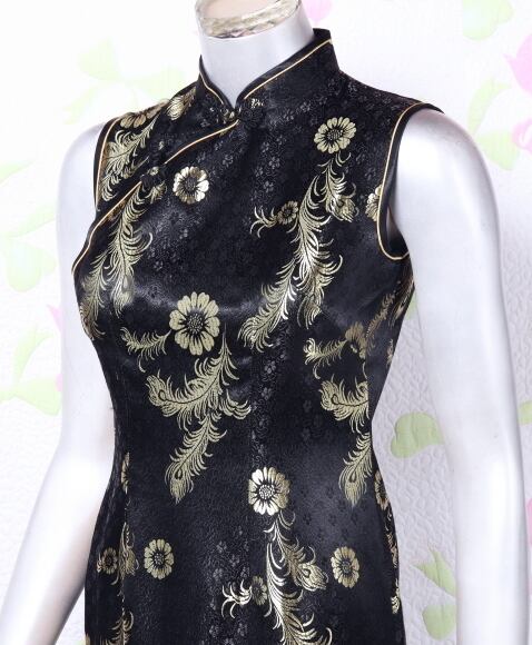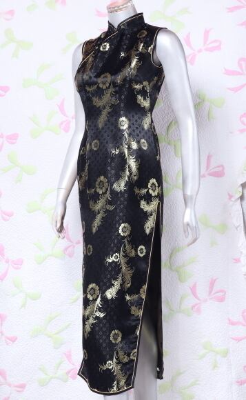 金糸刺繍のロングチャイナドレス。黒地にゴ-ルドの刺繍がとても豪華で魅力的。スリムな大人の女性を醸し出してくれる一着です。裏地なし。右サイドファスナ-有。両サイド62cmのスリット有。!!