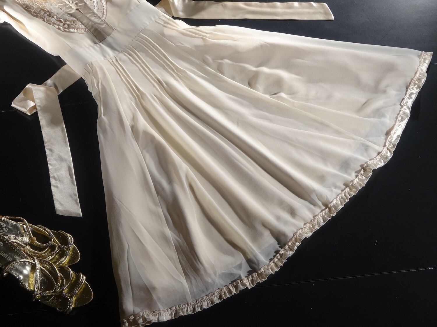 配色がとても美しいエレガントなワンピ-スです。デザイン性のあるスタイルが魅力的。胸元のフリルがとても豪華です。裏地あり。