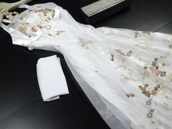 ウエストから裾までのランダムカットのコントラストが美しいデザイン。着る人の魅力を十分に引き出してくれる一着です。胸下のベルトがポイントとなっています。スト-ル付き。裏地あり。