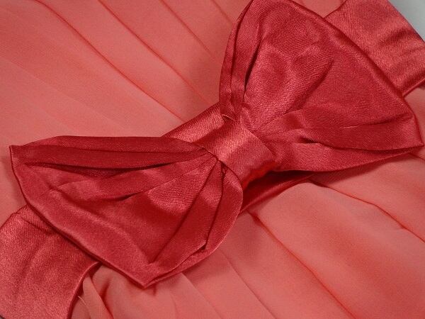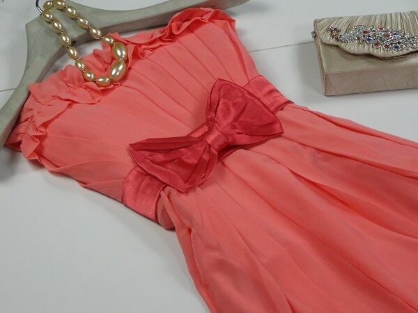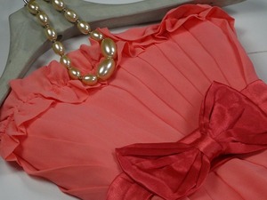 女性らしいカラ-とウエストのサテンリボン胸元部分のギャザ-とフリルがとても可愛らしいベアトップのドレスです。裏地有り。