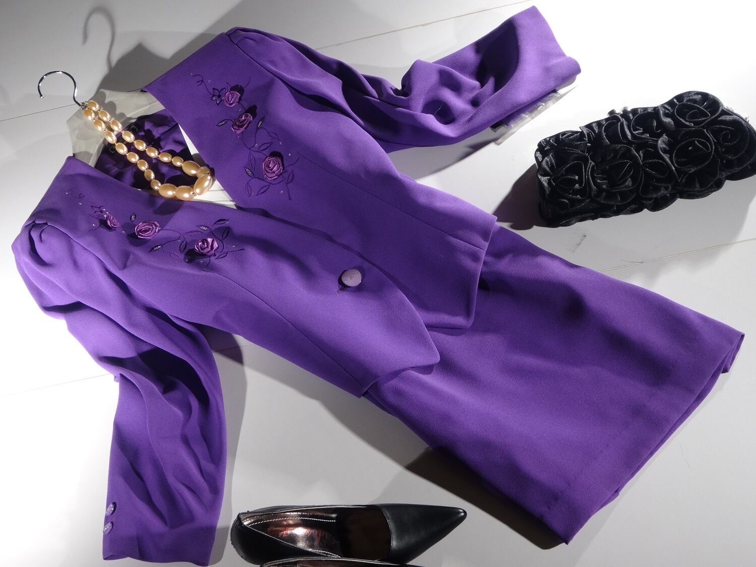 鮮やかなパープルカラーが印象的なジャケットとスカートのセット。ジャケットは長袖に肩パッド付。前1つボタン留め。襟のV字に沿って、肩から胸元まで薔薇の立体モチーフが施されており、エレガントな印象に。シンプルなラインのスカートとあわさり、品の良いシルエットに仕上がっています。ワンランク上の大人の装いを演出してくれる一着です。スカートはサイドゴム仕様、後ろファスナー。裏地あり。日本製。
