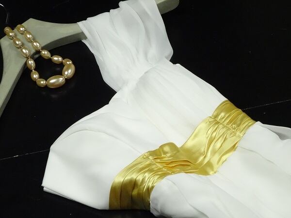 幅広ワンショルダーがセクシーなロングドレス。フロントは、ショルダーからウエストまで半分タックがほどこされ、半分はすっきりとしたシンプルな作りになっています。背中は中央でウエストから上にかけて編み紐用に、紐を通してとめるタイプ。パーティや結婚式、コンサートなど、様々なシーンで活躍してくれる一着です。背中編み紐留め。裏地あり。