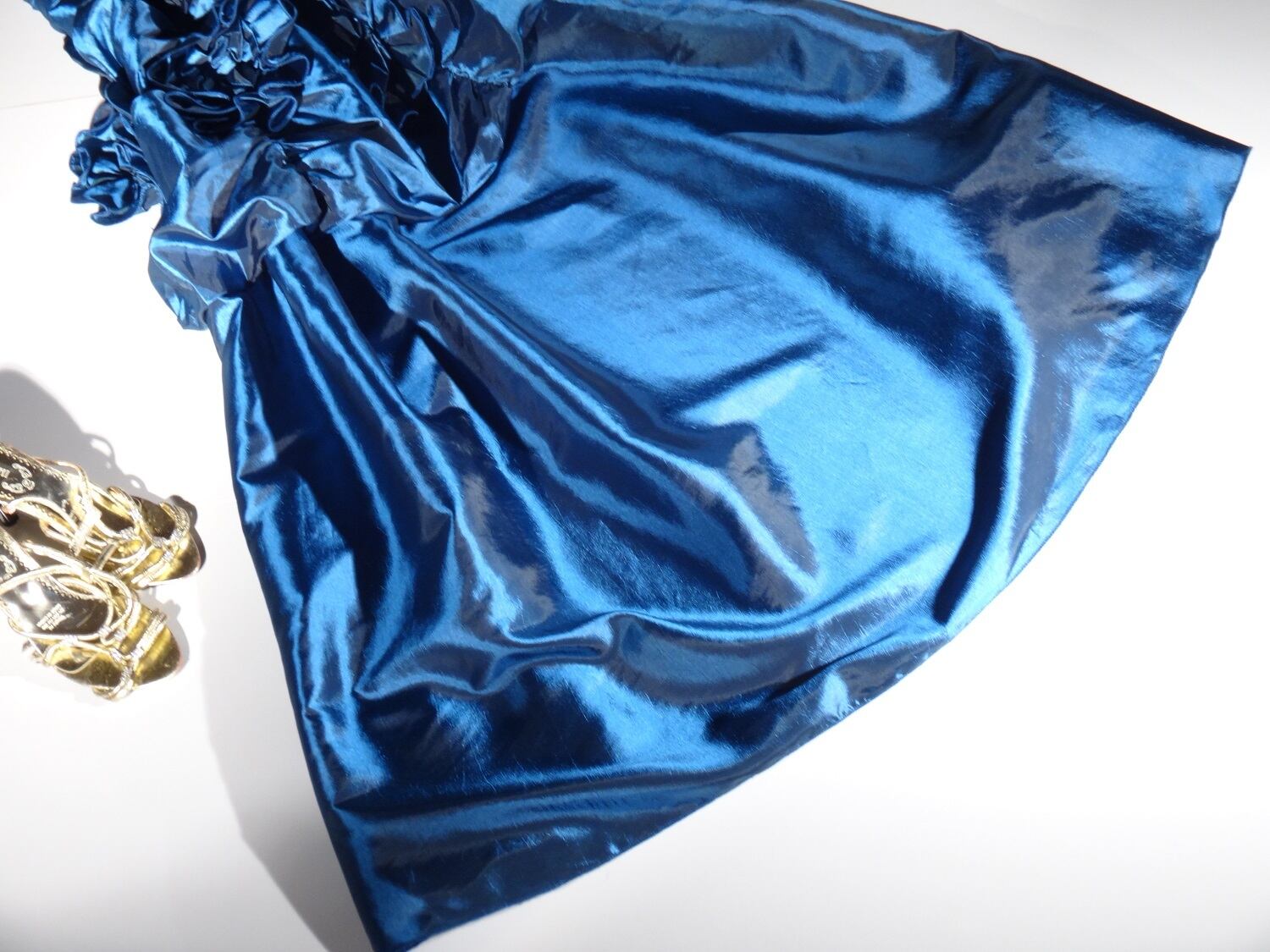つややかなサテン生地の胸もとやスカート部分に、立体的なフラワーモチーフがあしらわれた、鮮やかな青のロングドレス。胸もとは縦プリーツをボリュームを出し、スカート部分のフロントは生地をつまみ、バルーンのように膨らみをもたせ、間をウエストの横タックがキュッと全体を引き締めています。背中部分がシャーリング仕様になっているので伸縮性があり、着心地の大変良いデザイン。パーティや結婚式、コンサートなど、様々なシーンで活躍してくれる一着です。肩紐は約12cm~17cmで調整可能。ファスナーなし。背中シャーリング。裏地あり。