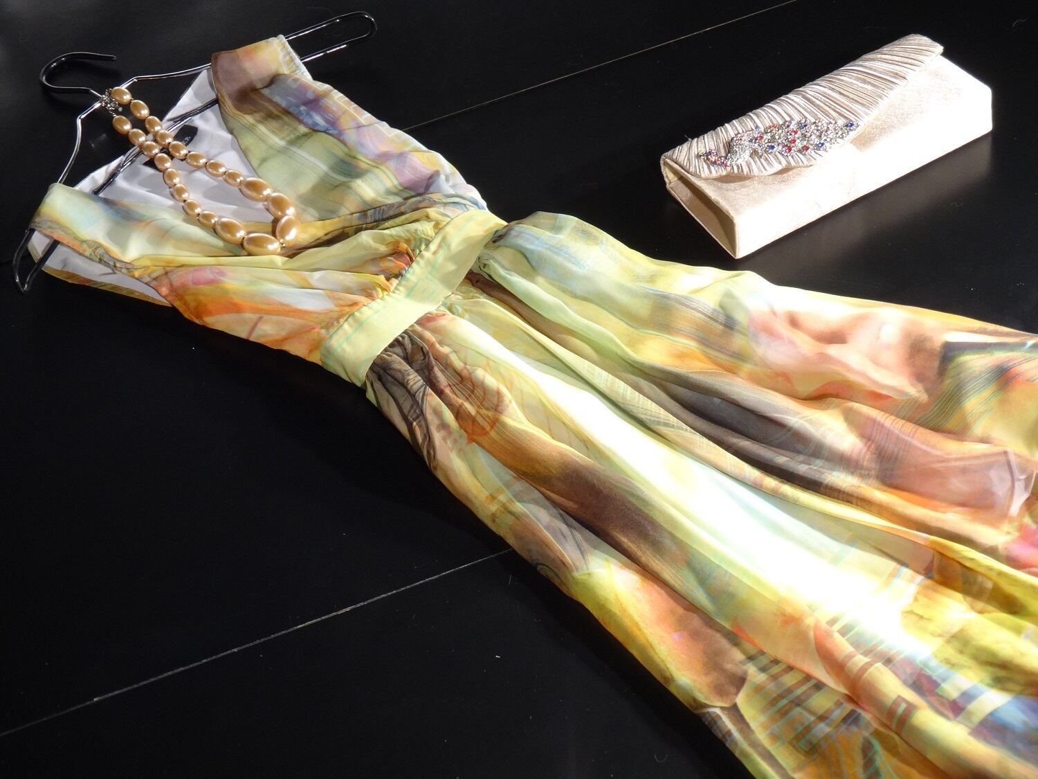 しなやかなシルク生地にカラフルなプリントがほどこされたマキシ丈ワンピース。胸元には丸いリングに幅広リボンがあしらわれています。 エレガントでキュート。魅力的なデザインです。11号表示ですが細めです。9号~11号位の方に。右脇ファスナー。裏地あり。