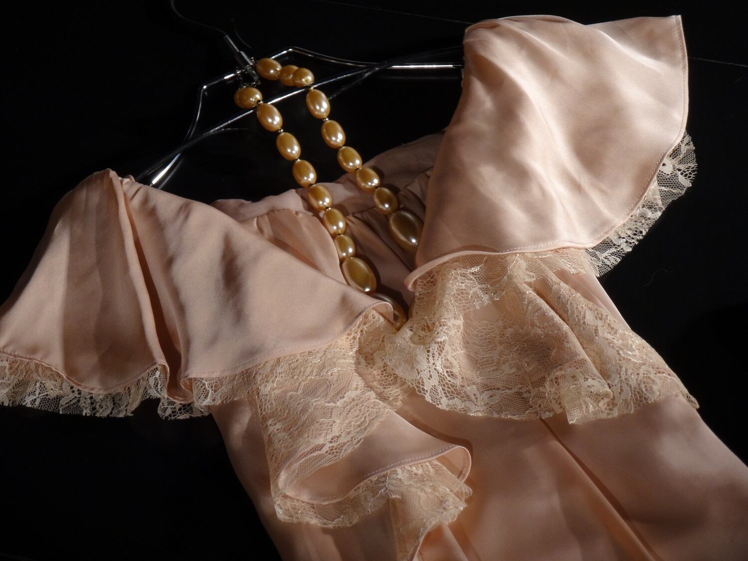 シルクのような質感とピンクベ-ジュの色彩のとても美しいドレスワンピです。袖部分の流れるようなフリルが大変女性度UPです!!裏地有。