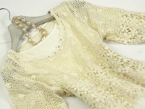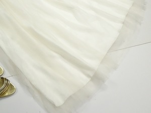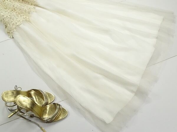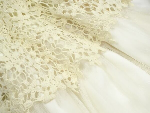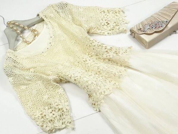 コットンかぎ針編風プルオーバーとノースリーブマキシ丈ワンピースがセットになっています。プルオーバーは鉤針編風仕様で、襟もとに小さなビジューがあしらわれています。ワンピースはノースリーブで、トップス部分は伸縮性のあるジャージ素材。スカート部分はサテン生地の上にたっぷりとしたチュールが二重に被さっています。セットで着てもいいですし、プルオーバーとワンピース別々のコーディネートも楽しんでいただけます。ワンピースはウエストがゴム仕様ですので伸縮性があり、ゆとりを持って着用頂けます。ファスナーなしのかぶるタイプ。