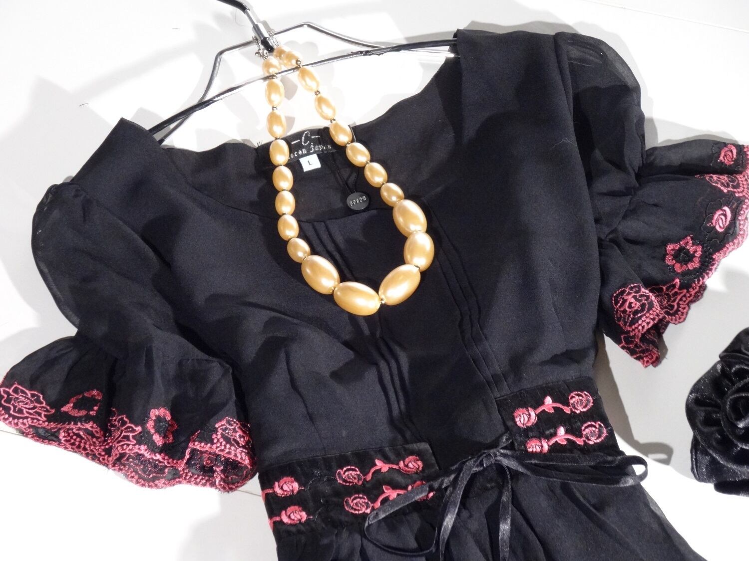 ピンクロ-ズの刺繍が華麗で、女性的な輝きをアップさせてくれるワンピ-スです。上品で優しい大人の女性を表現してくれるお洋服をこれからの季節にいかがでしょうか。ファスナーあり。裏地あり。