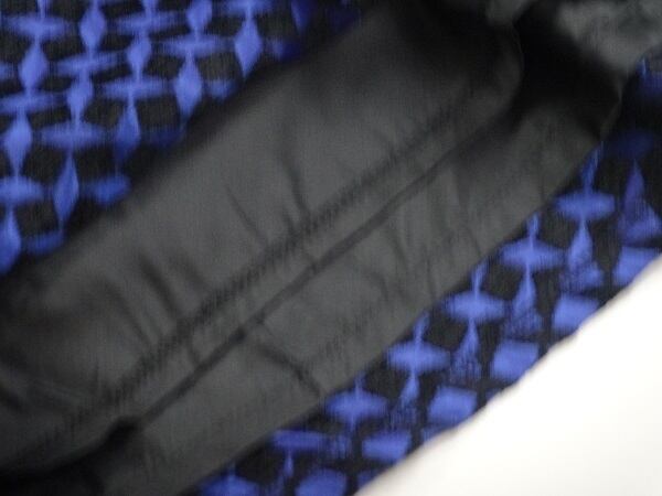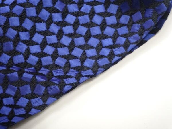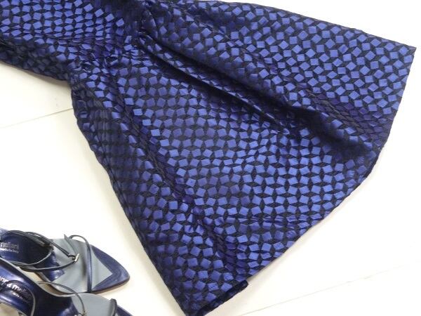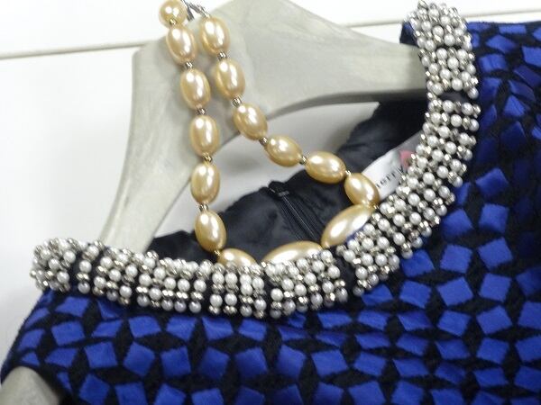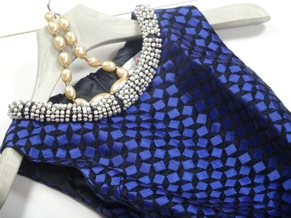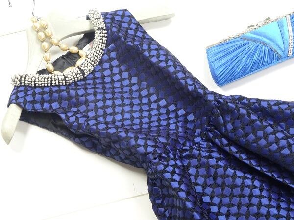 首元のビジュ-がとても華やかなワンピース。黒地ベースに青のサテンのスクエア模様がランダムに配置され、襟ぐりにはたくさんのフェイクパールやビーズ、ラインストーンがあしらわれています。ウエスト切替で裾までのぷっくらとしたフレアのAラインシルエットが、女性らしい大人の雰囲気を醸し出してくれます。パーティやイベントなど、どんなシーンにも活躍してくれます。背中ファスナー。裏地つき。