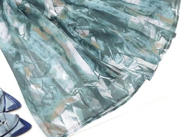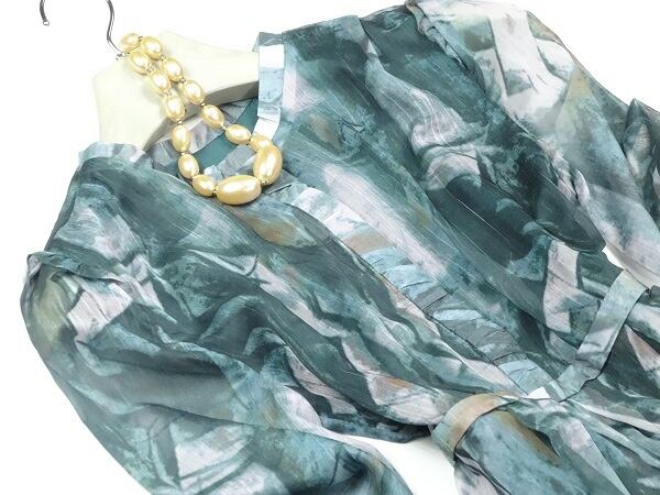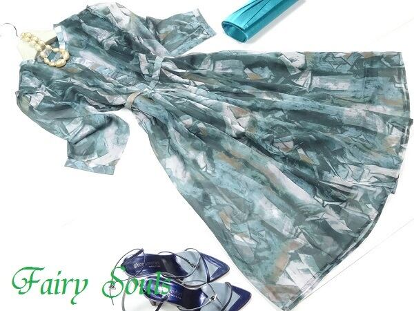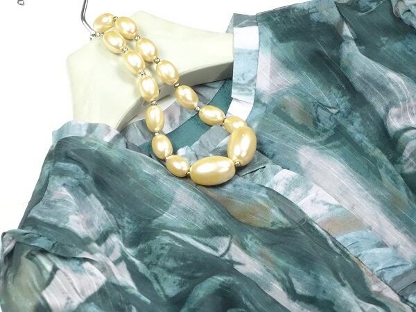 深いグリ-ンの模様のプリントが大人の女性度UP!!シックでとてもお洒落なワンピースです。結婚式や二次会様々な会合など注目されること間違いないとおもいます。ファスナーなし。裏地有り。