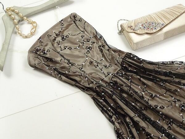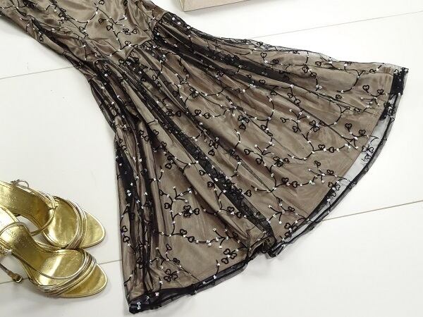 シックなブラウンサテンの上に花柄とラインストーンをあしらったチュールがゴージャス感を漂わせているドレスワンピース。ウエストの大きなブラックサテンのリボンがアクセントに。華やかでいて上品な一着です。ウエストリボン付。左脇ファスナー。裏地あり。