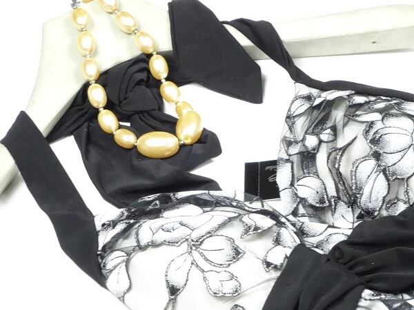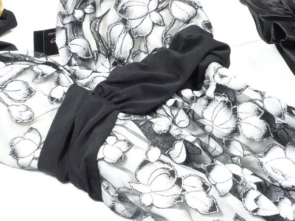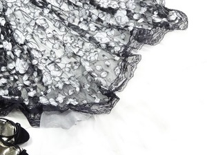 ウエストリボンモチーフチュール仕立てのドレスワンピースです。白の生地の上に黒のレース生地が被さり、レースにあしらわれた花模様が美しく浮かび上がっています。裾はたっぷりとした白のチュール仕立てになっていて、ウエストのリボンがインパクトのある印象を与えています。裏地付。ファスナ-なし(かぶるタイプ)。