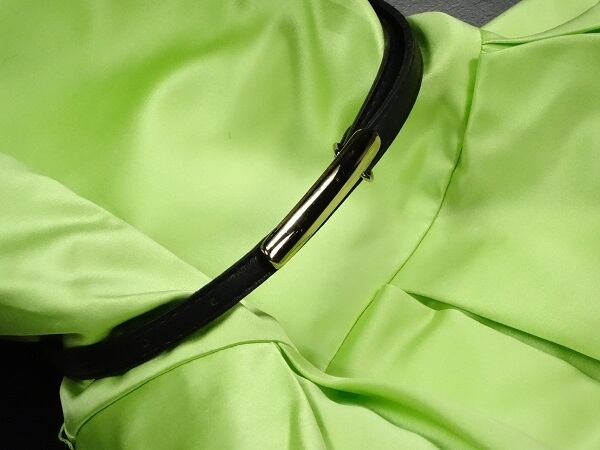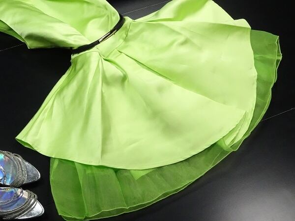 贅沢な高級感、艶サテンの生地が華やかな黄緑色のミニドレス。サイドが中央よりやや短いフレアラインは女性らしさいっぱい。スカート下には、オーガンジー素材が見えているのでフォーマルな印象に。しっかりとした生地なのでスカートラインも可愛く広がります。裏地有。背中ファスナー有。