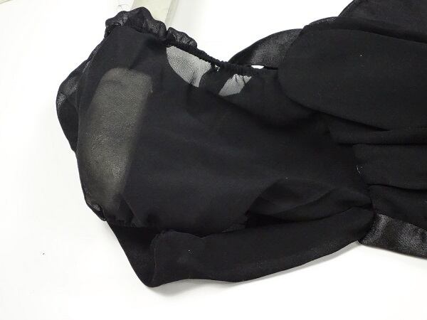 ふっくらと丸みのあるシフォンの袖が可愛いワンピース。えりぐり、そでさきはゴム仕様で伸縮性があり、スカート部分は3段のシャーリング。ウエストの太いサテン地ベルト(縫い付け、取り外し不可)がキュートな印象にクールなテイストをプラスしています。ファスナーあり。裏地有。