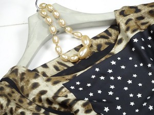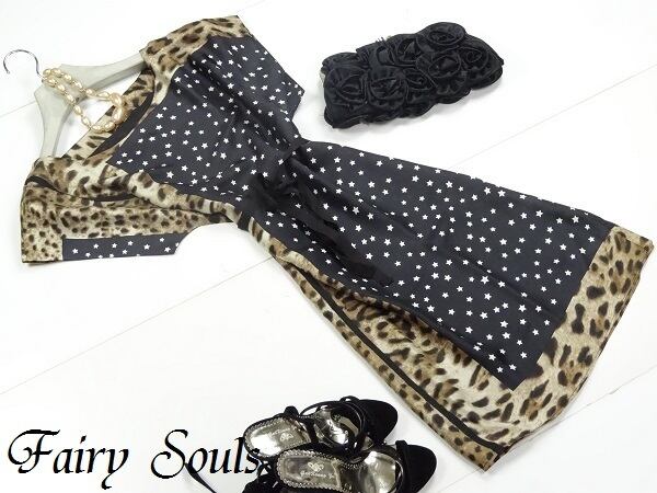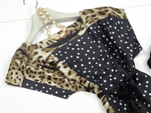 ひょう柄と星柄が絶妙なコンビネーションを紡ぎ出しているお洒落なワンピースです。ゴム仕様のウエストベルトをはずすと大きな四角形になっています。異種柄をクールに組み合わせた軽くてしなやかな、魅力的な一着です。被るタイプ。裏地付。