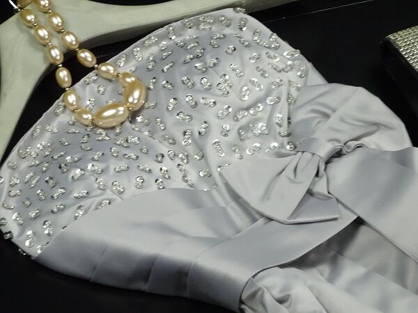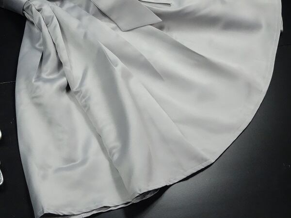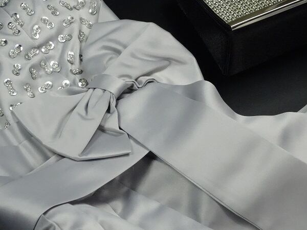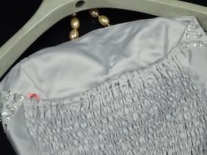 つややかな生地をたっぷりと使用したミニドレス。胸もとにはラインストーンのついたスパンコール飾りをふんだんにあしらっています。ウエストには大きなリボン飾り。ハイウエストになっているので下半身が長く見える綺麗なデザインになっています。背中はゴム仕様になっているので、伸縮性があり着心地は抜群。ウエストのリボンは取り外し不可。透明な取り外し可能なストラップ付。裏地なし。