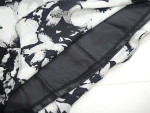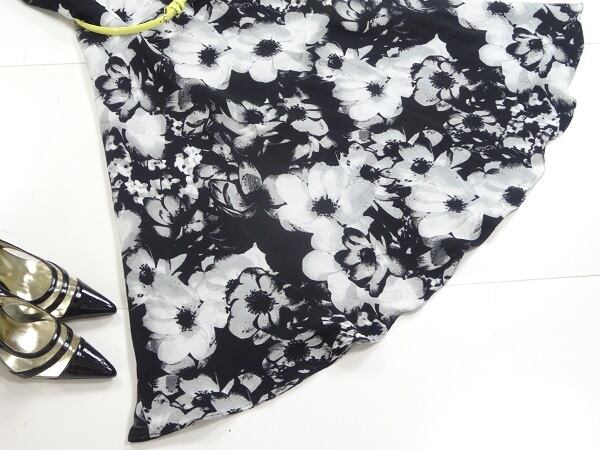素敵なモ-ドの花柄ドレスワンピです。黄色のベルトがアクセント。デコルテ部分はレ-スになっていてセクシ-なデザインです。裏地有。脇下ファスナ-有。ベルト付。