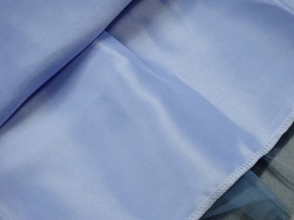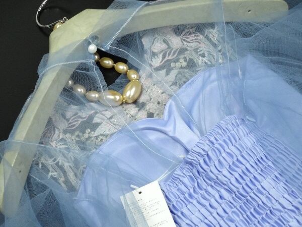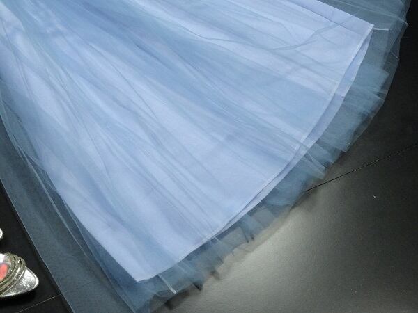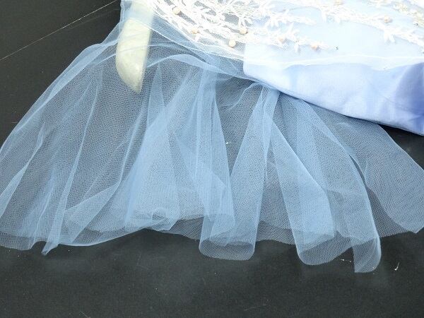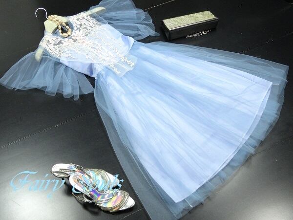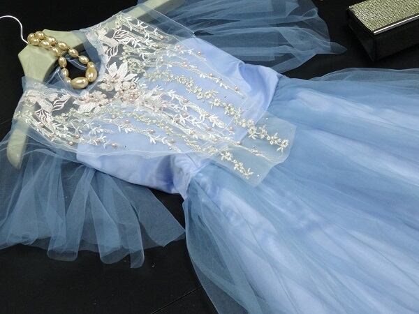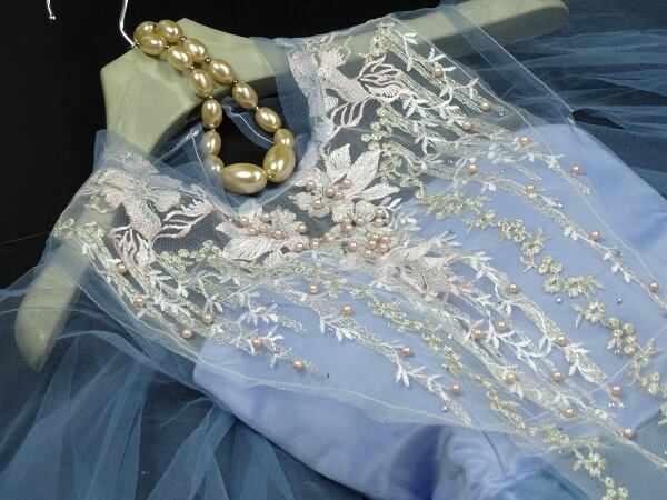 刺繍とチュールのワンピースドレス。水色のサテン地の上に刺繍と丸玉ビーズをあしらった同色のチュールを重ねた華やかなデザイン。袖のチュールが気になる二の腕を隠してくれます。背中はシャーリング仕様になっているのでサイズにゆとりをもって着用いただけます。パーティやライブ、イベント、結婚式など、どんなシーンでも活躍してくれる一着です。裏地なし。背中シャーリング仕様。右脇下ファスナー有。胸パット付き。