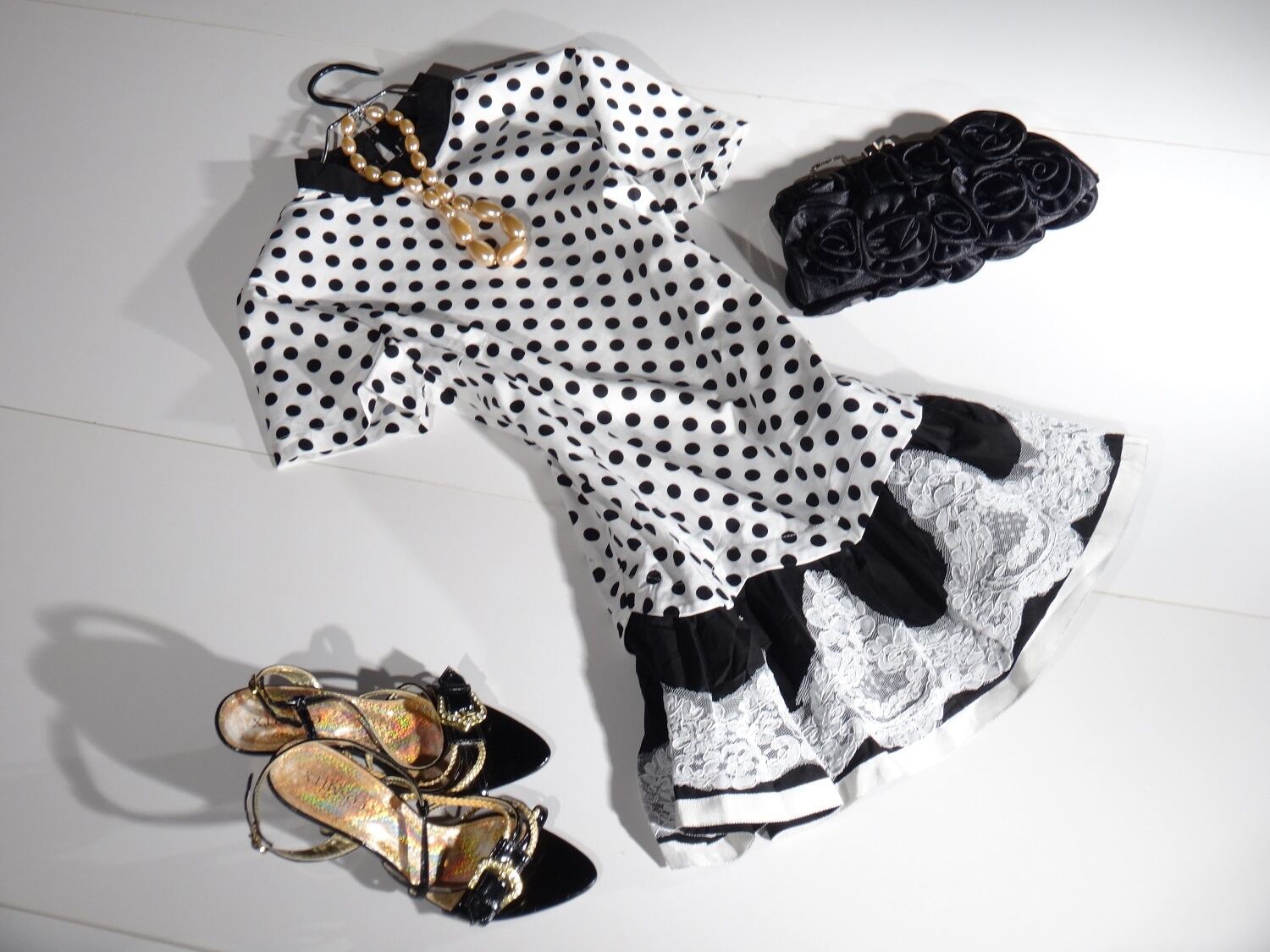 トレンド感のある華やかなヌ-ドのワンピ-スです。水玉柄の生地とスカ-トのレ-スが女性らしさをUPしています。裏地なし。
