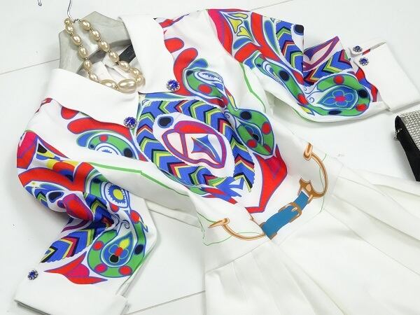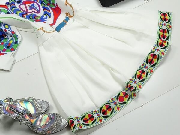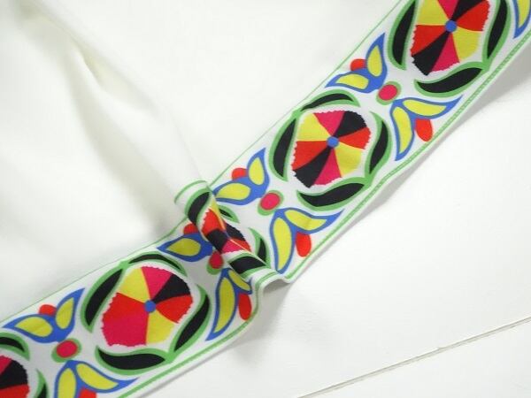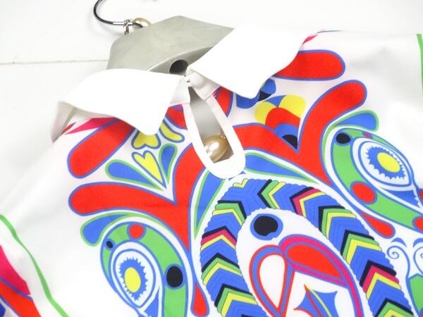 エスニック調のデザインがプリントされたすてきなワンピ-スです。色彩がとても素敵でビジュ-がアクセントになります。裏地付き。
