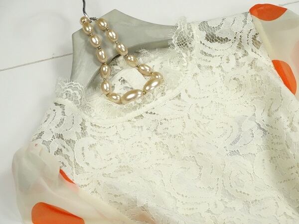 透明感のある素材使いと、繊細なレースがとてもオシャレで、しぐさを優雅に見せてくれる贅沢なお洋服です。上品で優しい大人の女性を表現してくれます。 裏地有り。