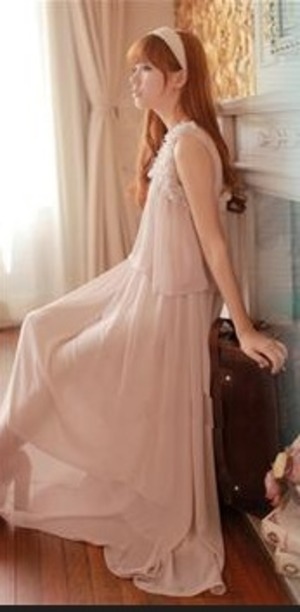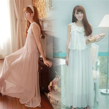 天使のような胸元花モチーフのマキシ丈ワンピースです。肩から胸元にかけて可愛らしい同色の花のモチーフがあしらわれ、ウエストをフリルが隠すデザインです。ウエストはゴム仕様ですので幅をもったサイズの方に着て頂けます。軽やかでしなやかな生地は歩くたびにひらひらと揺れ、足元を美しく見せてくれます。裏地付。