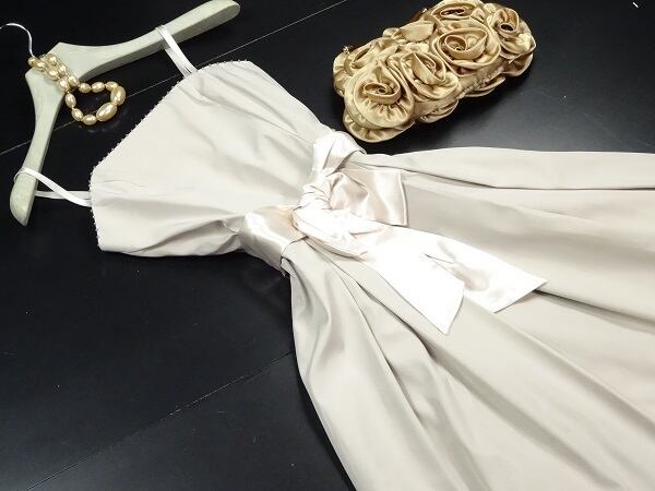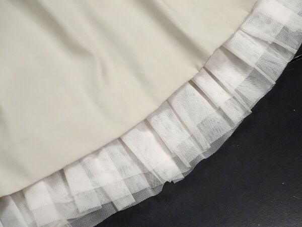 落ちついたベージュカラーのミニドレス風ワンピース。しっかりとした生地の裾からチュールが可愛く覗いているアンバランスさがユニークで魅力。胸元の小さなラインストーン飾りとウエストのサテンリボンが、全体をシックな中にも華やかな印象に仕上げています。キャミタイプのワンピースとしても、またちょっとしたフォーマルなシーンでミニドレスとしても着用頂ける一着です。伸縮性なし。肩紐調整不可。サイドファスナーつき。裏地あり。