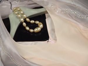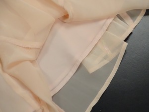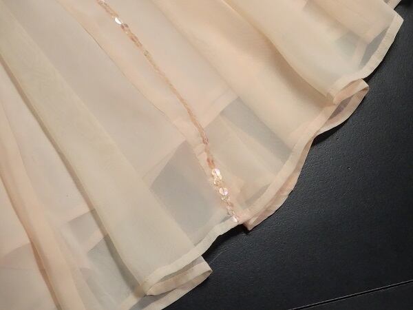 しなやかなピンクのシフォン、ストール付の膝丈ミニドレス。前後V字カットの襟ぐりがデコルテラインを美しく魅せて、左から右下がりに切替のあるウエストが優雅な印象。切替から下、スカート微分は、シフォン生地をたっぷりと使用したフレアタイプ。斜めにスパンコールのラインがあしらわれており、裾も右へ行くほど長くなる変形デザイン。ワンピースと同じスパンコールのラインがあしらわれたオーガンジーのストールで、品良く、エレガントな印象を与えてくれる一着です。ストール付。背中ファスナー。裏地あり。