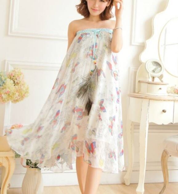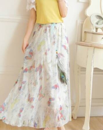 全体にカラフルなバタフライ柄がプリントされたマキシ丈シフォンのスカート。軽やかでしなやかなシフォン生地全体にカラフルな蝶の模様がプリントされており、ウエストは総ゴム仕様なのでサイズ的にゆとりを持って着用頂けます。ウエストからのびた紐リボンの孔雀の羽根飾りが優雅さと華やかさをアップ。ウエストを胸もとにもってくると、ベアタイプのワンピースにもなるスカートとワンピースの2wayタイプ。普段着はもちろん、リゾートやライブ、パーティにと、様々なシーンに活用頂ける一着です。裏地付。