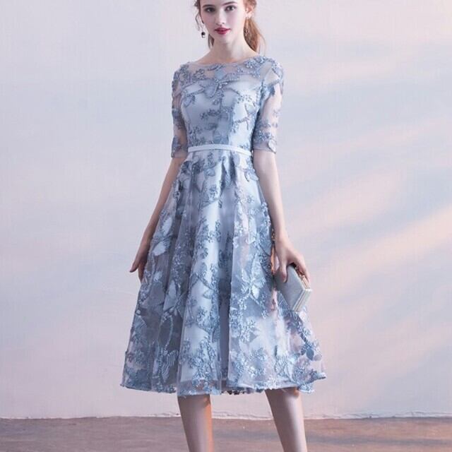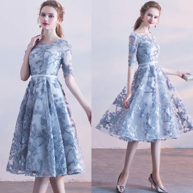 立体刺繍レースミディアムドレスです。全体に刺繍が施されたレ-スがサテン地に重ねられとても美しく豪華で大人の女性を醸し出してくれるエレガントなドレスです。デザイン性のあるスタイルがとても魅力的な一着です。全体的に優しい感じに仕上げられています。裏地なし。背中網掛け。背中腰より下ファスナ-有。胸パット付き。