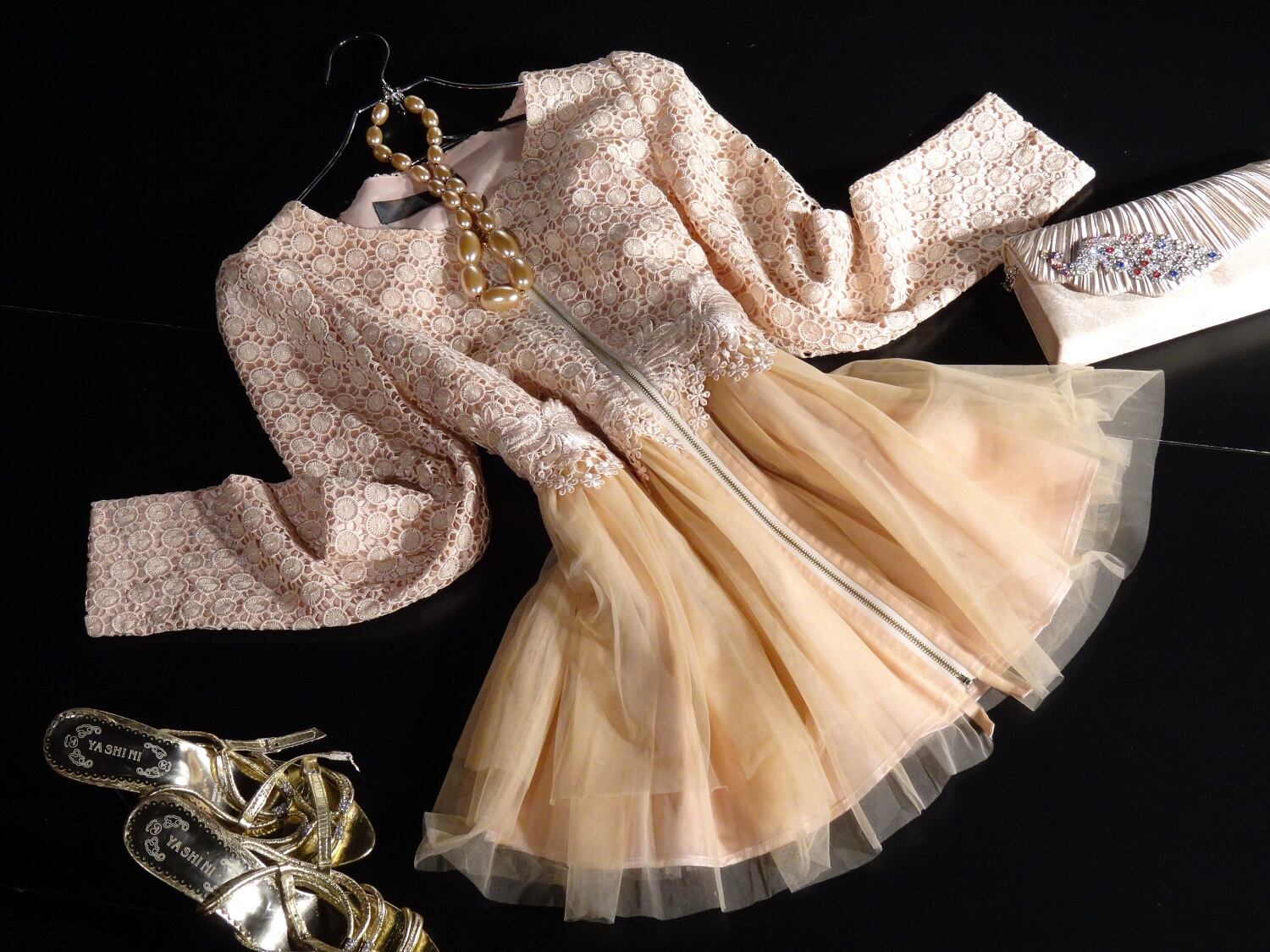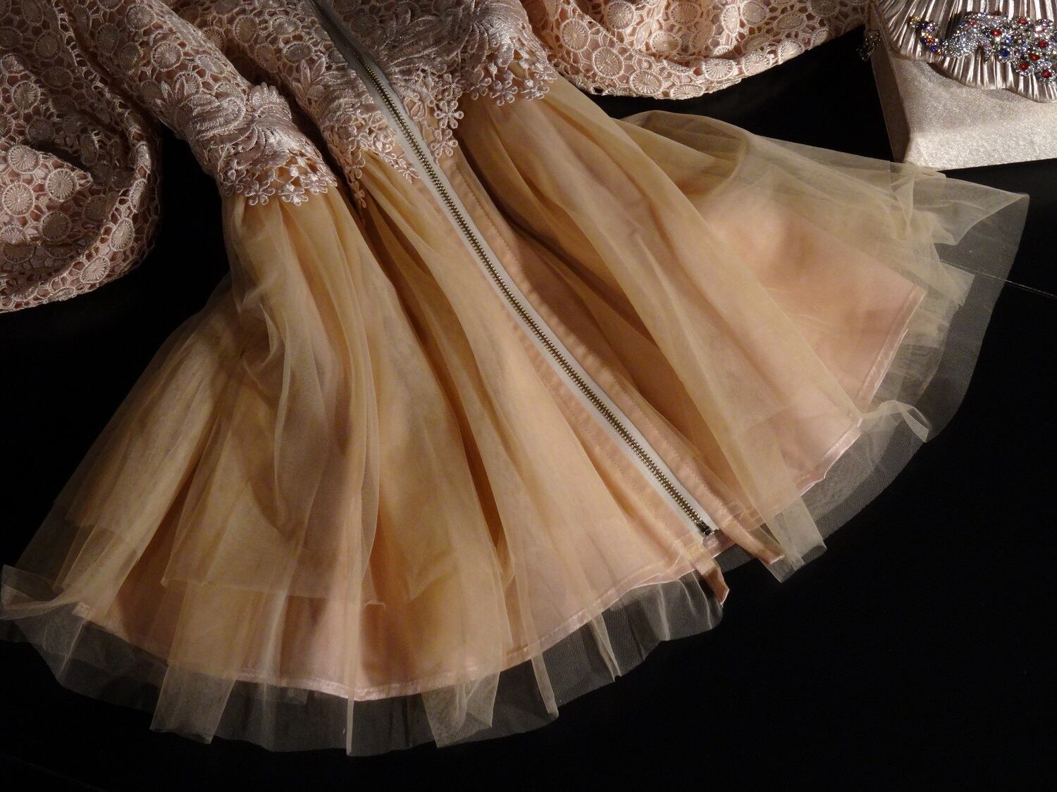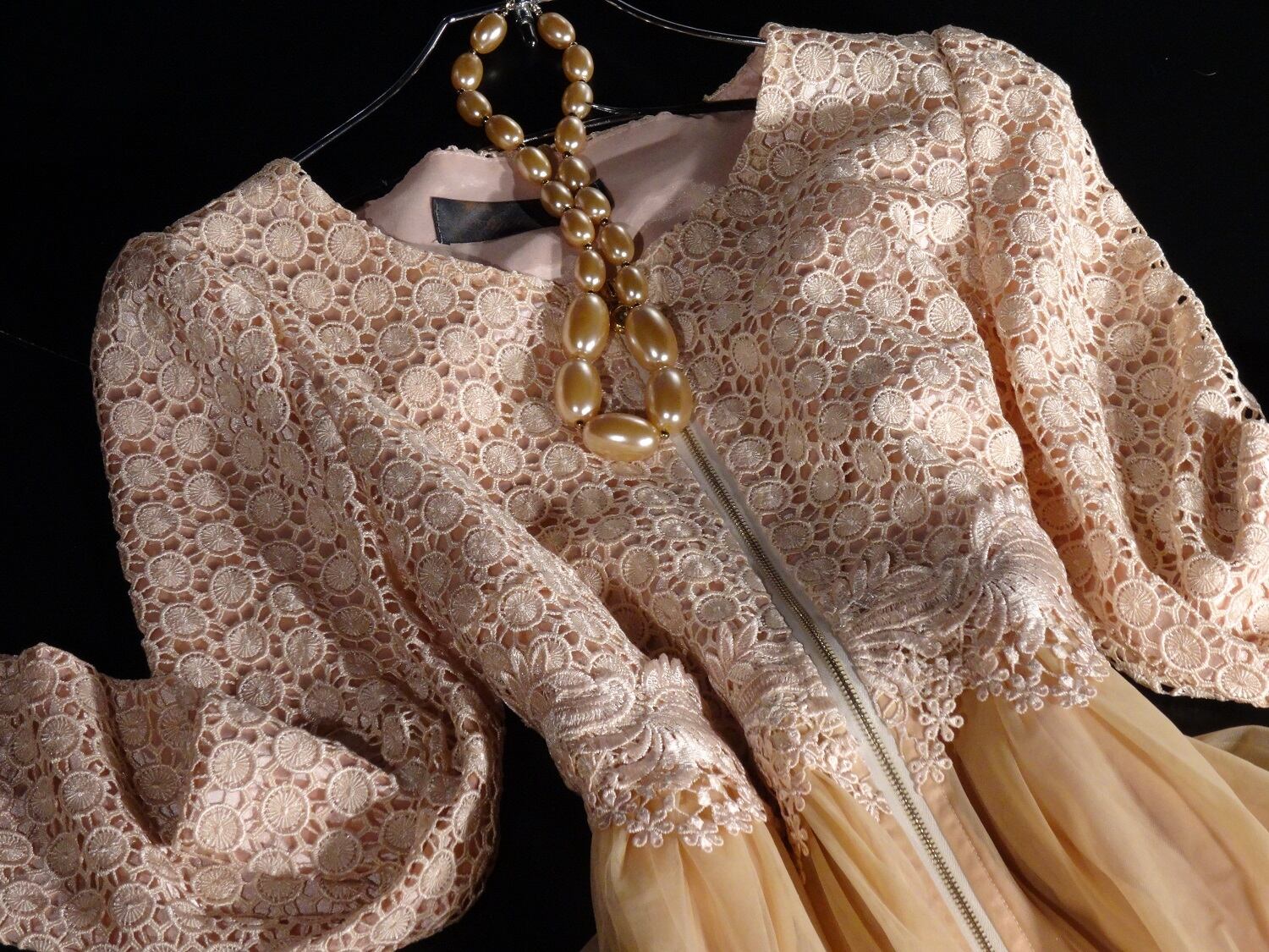 綺麗なAラインに前ファスナー。トップスは緻密なレース仕様。スカートはピンク地の上に目の細かいチュール地があしらわれています。シンプルなボートネックが、全体を上品で優しい印象に仕上げています。ジャケットとしても、またそのままで少し短い丈のワンピースとしても着用頂けます。前ファスナー。裏地あり。