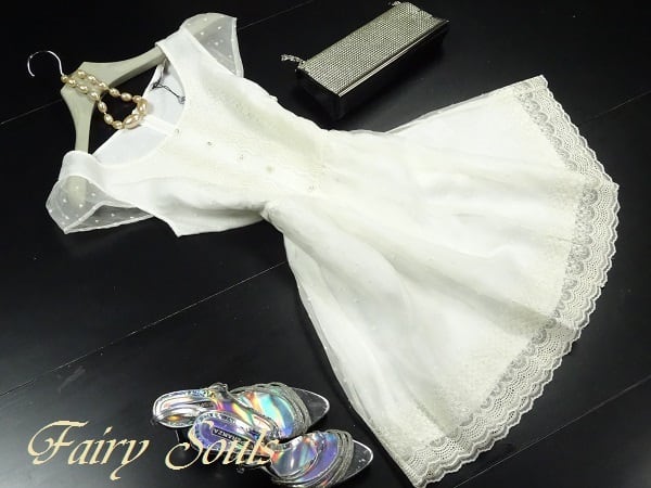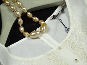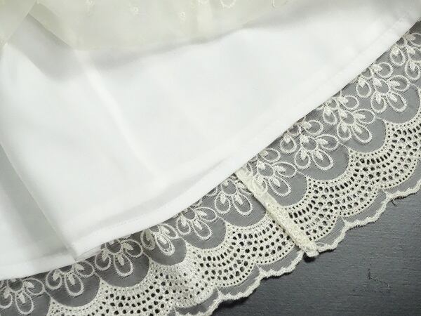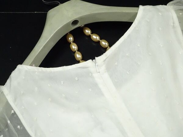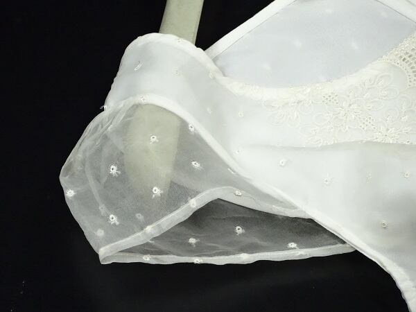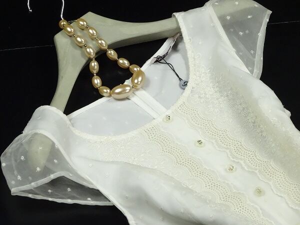 レース刺繍が美しいシルク100%のワンピース。光沢のあるアイボリー系ホワイトに、やさしいレース刺繍が品よくほどこされています。袖はシースルーのパフスリーブタイプ。フロントには金のリボン飾りがついた白の貝ボタンがアクセントに。ふんわりフェミニンな印象の一着です。表示は「L」ですが、実際は7~9号位のサイズです。透け感がありますのでインナー着用をお勧めします。背中ファスナー。裏地付。